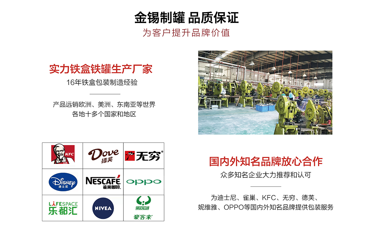 廣州市金錫五金制品有限公司成立于2016年,是已有13年生產經驗的實力廠家。我廠是專業定制優良馬口鐵盒、鐵罐、禮品盒、茶葉罐、月餅盒等金屬鐵盒包裝的制罐企業,我們擁有超過6000平方米的標準現代化廠房及八條生產線。公司集產品研發、設計、生產、銷售于一體,技術優良,實力雄厚。通過十多年的制罐經驗,我們擁有專業的技術團隊,嚴格的作業流程、完整的品質保障體系、完善的銷售以及售后服務系統。